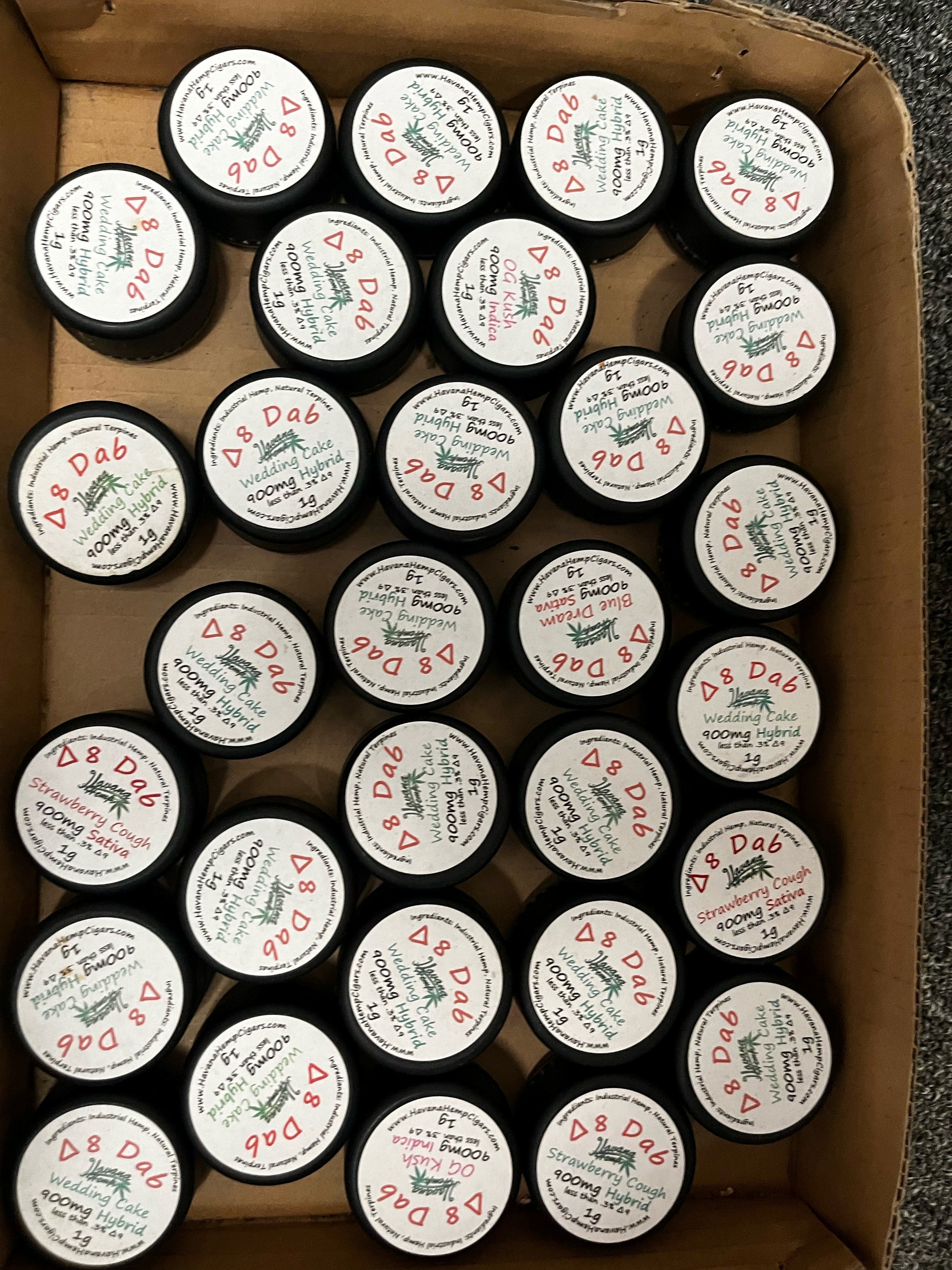 One Gram Delta 8 dabs are 900mg of D8. Comes on round glass container. Hybrid wedding cake.